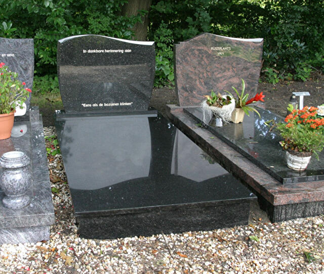 Bij De Weijs Natuurstenen presenteren we met trots onze Grafsteen golfkop met vlakke dekplaat. Het kenmerkende kopstukje, met zijn prachtige vorm, voegt een vleugje elegantie toe aan het strakke design van deze grafsteen. Onze Grafsteen golfkop met vlakke dekplaat is verkrijgbaar in een breed scala aan kleuren, waaronder het schitterende Star Galaxy dat op de afbeelding te zien is, maar ook andere kleuren natuursteen zijn mogelijk. Bij De Weijs geven we u de vrijheid om uw grafsteen volledig naar uw eigen smaak samen te stellen. Of het nu gaat om het graveren van persoonlijke details of het toevoegen van symbolen, wij staan klaar om uw eerbetoon uniek te maken. Met onze geruststellende garantie van 30 jaar kunt u met vertrouwen investeren in een blijvende herinnering. En hoewel split, tuinaarde of houtsnippers geen opties zijn voor deze grafsteen, bieden we wel een naadloze integratie in elke omgeving, zodat uw grafsteen perfect past bij de sfeer van de rustplaats van uw dierbare.
